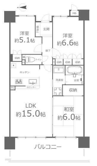 間取り | 3LDK | 間取り内訳 | LDK15畳 和6畳 洋5.1畳 洋6.6畳 |