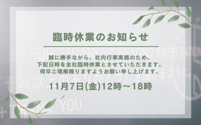 誠に勝手ながら、社内行事実施のため下記の日時を全社臨時休業とさせていただきます。